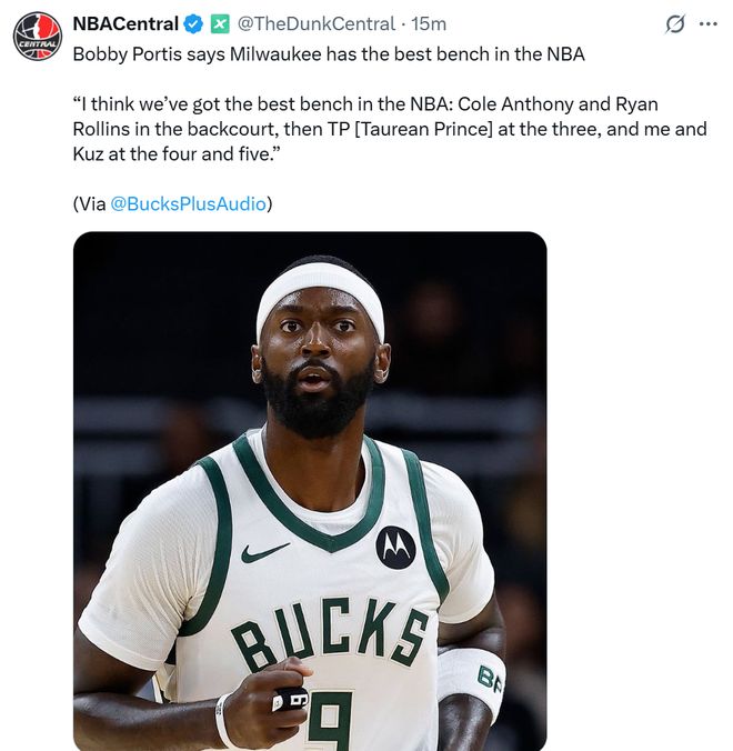 雷速体育10月22日讯 知名账号NBACentral援引雄鹿媒体账号有关波蒂斯的言论。